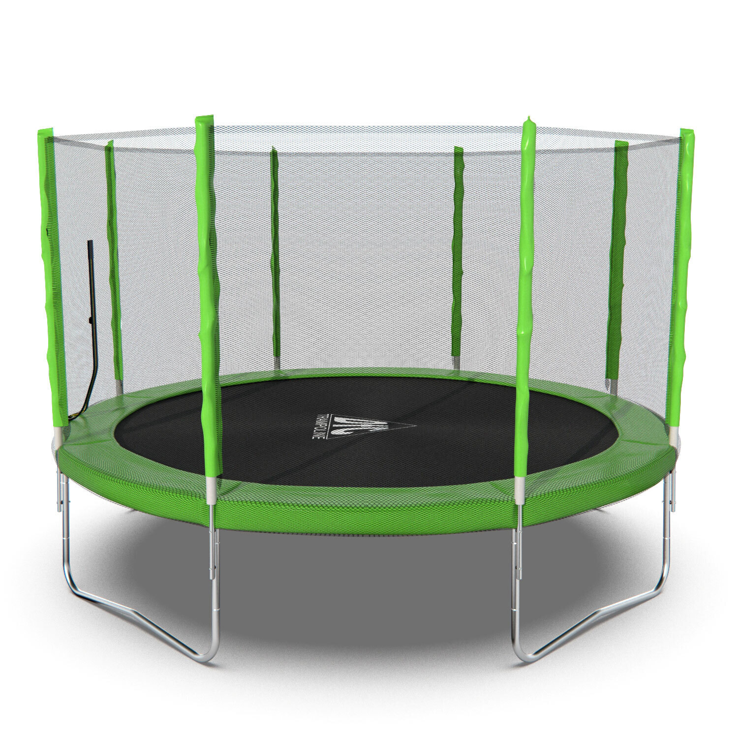 Обновленный батут популярной серии DFC TRAMPOLINE FITNESS . Батуты DFC давно известны на российском рынке. Они зарекомендовали себя как надежные, выполненные из качественных материалов, неприхотливые в использовании. Модель с внешней защитной сеткой и яркой  синей  расцветкой. Лестница в комплект не входит . Рекомендуем приобрести отдельно модели на 2 или 3 ступени, в зависимости от высоты батута. Высота батутов этой серии от 46 до 85 см. В комплекте с батутом поставляются ключи для сборки и подробная инструкция на русском языке. На батуты DFC предусмотрена гарантия сроком 12 месяцев. Батуты упакованы в прочную картонную упаковку из 5-слойного картона. Надёжность конструкции Особое внимание при изготовлении батутов компания DFC уделяется качеству. Надежность конструкции обеспечивается прочной рамой с оцинкованным покрытием, нанесенным методом холодной гальванизации.  Рама изготовлена из круглой трубы диаметром 38 мм и толщиной 1,3 мм. Пружины Пружины выполнены из высококачественной стали, которые имеют повышенную защиту от износа и растягивания, тем самым позволяя продлить срок службы батута. На батуте используется 72 пружины длиной 136 мм и диаметром 3 мм. Защитная сетка Внешняя защитная сетка, поставляемая в комплекте, обеспечит безопасность вам и вашим близким от случайного падения, изготовлена из высокопрочного нейлона, надежно крепится к  стойкам батута. Стойки под защитную сетку в количестве 8 штук, диаметром 25 мм и толщиной 1,2 мм. Высота защитной сетки 170 см. Для защиты детей вход/выход через сетку выполнен на молнии с фиксирующими защелками с внешней стороны. Прыжковое полотно и кожух Для обеспечения безопасности пользователя, пружины закрыты защитным чехлом (защитным матом). Высота батута от пола до прыжкового полотна 85 см. Диаметр батута составляет 365,76 см. Прыжковая поверхность выполнена из самого прочного на настоящий момент полипропилена последнего поколения "Перматрон". Имеет повышенную устойчивость к UV-излучению. Батут выдерживает вес пользователя до 150 кг.