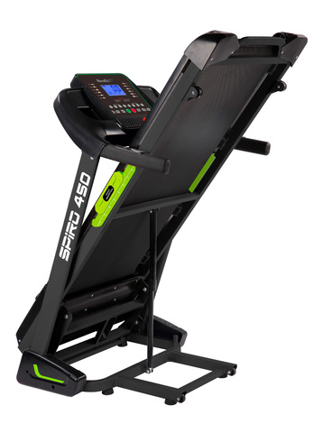 Электрическая беговая дорожка Housefit SPIRO 452 с мощным мотором 2.5 л.с., позволяющим развивать скорость до 16 км/ч, отлично подойдет для занятий бегом в домашних условиях. Размер бегового полотна 45х130 см считается наиболее оптимальным для комфортных занятий и позволяет выдерживать вес пользователей до 110 кг. Амортизационная система полотна "Soft-Run" с 4-мя эластомерами значительно снижает вибрации и ударную нагрузку на позвоночник, связки и суставы. Голубой LED дисплей выводит на экран основные параметры тренировки: время, скорость, дистанцию, калории, пульс. На выбор представлено несколько разноплановых встроенных программ, в которых используются различные виды тренировок, добавить разнообразия в тренировочный процесс можно с помощью, регулируемого электронным способом, угла наклона бегового полотна. Сделать упор на конкретный показатель можно в режиме целевых тренировок. Также в дорожке установлена система анализа телесного жира «Body Fat», она позволит измерить максимально точный процент доли жира в организме. Для измерения пульса пользователя установлены сенсорные датчики, расположенные на ручках беговой дорожки. За удобство складывания отвечает двухфазная гидравлическая система - она существенно облегчает складывание тренажера, а при раскладывании обеспечивает медленное опускание бегового полотна. Перемещение беговой дорожки происходит за счет 2-х транспортировочных роликов. Приятной для пользователя опцией является подставка под телефон или планшет.