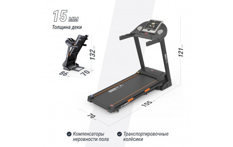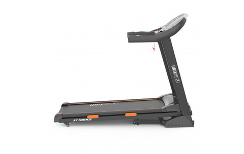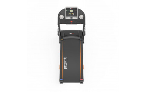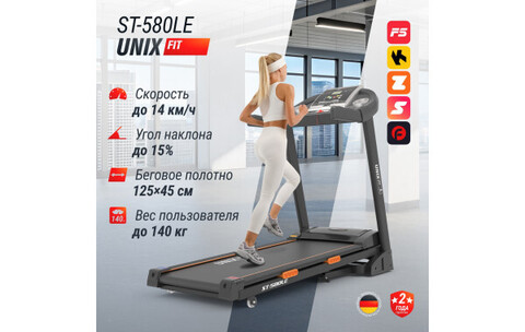 Беговая дорожка UNIX Fit ST-580LE идеальное решение для тех, кто ценит комфорт, эффективность и современный подход к фитнесу. Беговая дорожка станет не только личным тренером, но и верным помощником на пути к достижению ваших спортивных целей. Складная конструкция домашнего кардио тренажера делает беговую дорожку отличным выбором для небольших пространств. Вы можете легко убрать ее после тренировки, не занимая много места в комнате. Элегантный и современный дизайн дополнит интерьер вашего помещения, создавая атмосферу уюта и стиля. Благодаря мощному двигателю с воздушным охлаждением и системой шумоподавления Smartex с пиковой мощностью 3 л.с., тренажер гарантирует надежность и высокую производительность дорожки даже во время интенсивных тренировок и разгоняет ее до 14 км/ч. С интуитивно понятным интерфейсом и дисплеем 3,5" LED вы сможете легко отслеживать результаты: пульс, скорость, время, расстояние, уровень наклона, заданная программа и количество сожженных калорий. На панели расположены кнопки быстрого выбора скорости 2 км/ч, 4 км/ч, 6 км/ч, 8 км/ч, 10 км/ч, 12 км/ч для комфортной тренировки. Кроме того, дорожка оснащена 15-ю программами тренировок, которые помогут вам разнообразить занятия и поддерживать мотивацию. Благодаря встроенной системе автоматической регулировки угла наклона до 15%, вы сможете легко изменять уровень сложности тренировок. Это позволяет имитировать реальные условия бега на улице, что сделает занятия более эффективными и разнообразными. Увеличение угла наклона активирует больше мышц, помогает сжигать больше калорий и улучшает общую физическую подготовку. Антискользящее беговое полотно 125 х 45 см и система амортизации электрической дорожки для бега и ходьбы обеспечивают максимальную безопасность во время тренировок. Вы можете сосредоточиться на тренировке, не беспокоясь о травмах. Мягкое покрытие снижает нагрузку на суставы, что особенно важно для людей с проблемами опорно-двигательного аппарата. Пульсометры на поручне. Измерение частоты сердцебиения происходит, когда пользователь держится за пульсометры на поручне обеими руками. Система автоматически определяет частоту сердцебиения и отображает ее на дисплее. На поручнях предусмотрены дополнительные кнопки управления: регулировка скорости +/- и регулировка угла наклона +/-. Bluetooth-соединение позволяет слушать музыку во время тренировки через 2 встроенных динамика. Создайте свою идеальную атмосферу для занятий и наслаждайтесь процессом! Также, имеется возможность синхронизации беговой дорожки с мобильным устройством при помощи приложений FitShow, Kinomap, ZWIFT, SPAX, FITLOG (подключение через Bluetooth) с возможностью управления беговой дорожкой и сохранения тренировок. ДОПОЛНИТЕЛЬНЫЕ ХАРАКТЕРИСТИКИ Цвет  Черный / Серый Приложения для синхронизации  FitShow, Kinomap, ZWIFT, SPAX, FITLOG (подключение через Bluetooth) Рама  особопрочная с двухслойной покраской Двигатель  2.5 л.с. Shlümdenger Electric (постоянный ток DC) Система охлаждения двигателя  есть (воздушное) Уровень шума двигателя  низкий (система шумоподавления Smartex) Беговое полотно  двухслойное антискользящее покрытие (толщина 1.4 мм) Система амортизации  4 эластомера (aircursion) + 4 плоских эластомера (снижают нагрузку на позвоночник и суставы) Консоль  диагональ 3.5" LED Спецификации программ  3 ручных режима и 12 автоматических программ Дополни