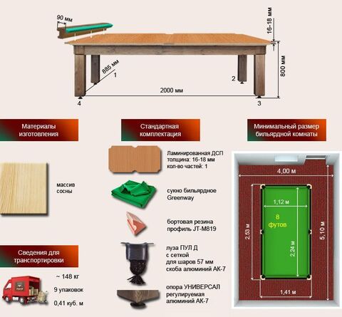 Бильярдный стол для пула "Паж" (8 футов, сосна, ЛДСП 16-18)