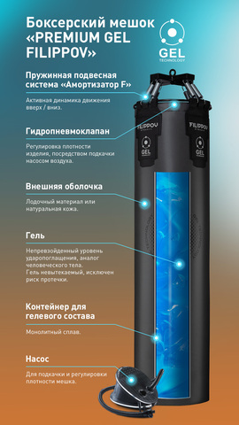 Боксерский мешок PREMIUM GEL FILIPPOV. Уникальный гелевый наполнитель для безопасных и комфортных тренировок. Жесткий наполнитель приводит к проблемам с суставами. Мягкий наполнитель (ветошь, резиновая крошка) проседает, со временем образуя пустоты в ударных зонах. Эти проблемы решает гелевый наполнитель. Гель, это эластичная, мягкая и травмобезопасная субстанция, которая не передает отдачу на суставы. К тому же гель не сбивается, и сохраняет форму и плотность мешка на весь период эусплуатации. Следующее преимущество гелевого мешка - он практически не раскачивается при ударах, так как гель поглащает инерцию удара. Присутствует возможность самостоятельно регулировать плотность мешка ,путем подкачки воздуха через верхнюю крышку(насос в комплекте). Пружинная подвесная система за счет своей динамики создает ощущение реального боя. «Это лучший боксерский мешок» - мнение профессионалов. Основные показатели: - Материал изготовления: ПВХ - Наполнитель: гель - Высокий уровень комфорта при ударах за счет эластичного наполнителя. - Травмобезопасность за счет отсутствия отдачи гелевого наполнителя на суставы. - Стабильность наполнителя по плотности и форме максимально высокая на весь период эксплуатации. - Возможность протечки в течении эксплуатации исключена, гель является невытекаемой субстанцией. - Индивидуальное изменение жесткости мешка подкачка воздуха. - Уровень подготовки спортсмена: начальный / средний / продвинутый. - Возрастные ограничения спортсмена отсутствуют. - Защита рук: перчатки / без перчаток. - Возможные удары по снаряду: прямые, боковые, удары ногами. - Конструкция изделия: внешний чехол, внутренний гелевый контейнер, гидропневмоклапан, пружинная подвесная система. - Монтаж: к потолку, к стене. - Комплектация: мешок, подвесная система, насос. - Размещение: домашний спортзал, спортивный клуб. " Будь на шаг впереди своего противника " FILIPPOV DYNASTY