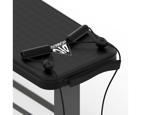 Скамья дополнительно оснащена креплениями для гантелей для удобного хранения, а также быстрого доступа к ним во время тренировки. Валик для ног диаметром 7,5 см и длиной 13,2 см с надежным креплением длиной 34 см. Эспандеры, поставляющиеся в комплекте длиной 80 см служат для дополнительного укрепления мышц рук.
