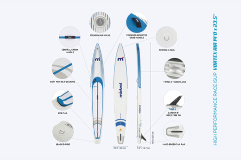 Надувная SUP гоночная доска Vortex Air 14’ шириной 23,5 дюйма разработана без компромиссов для достижения максимальной скорости и длительного скольжения и оптимально подходит для гонщика весом до 105 кг и максимальной нагрузкой до 125 кг. Эта конструкция Vortex Air объемом 280 л отличается плавным скольжением, так что каждый гребок обеспечивает положительную отдачу затраченной энергии. Хотя лучше всего он работает на ровной воде, при хороших навыках вы сможете легко прокладывать себе путь по неспокойным водам. Надувная доска Vortex Air race имеет самую широкую вершину непосредственно перед гребцом, поэтому она обеспечивает хорошую устойчивость в передней половине. Длинная коническая форма сужается к хвосту, способствуя отводу воды и уменьшая сопротивление. Будь то спринтерские гонки или гребля на длинные дистанции, Vortex Air отличается качественной конструкцией, которая улучшает ваши навыки гребли. Независимо от того, используется ли Vortex Air race SUP для тренировок вдали от дома, готовясь к гонкам на хардборде, или для соревнований, надувной SUP Vortex Air Race SUP отличается исключительными характеристиками. Нескользящий настил обеспечивает надежное сцепление и комфорт при гребле на полной скорости или в круизе, способствуя более длительным и комфортным занятиям. Наклонная вперед рукоятка захвата с левой стороны обеспечивает мгновенное управление захватом вне пляжа, старты в стиле Ле-Мана и быстрое восстановление при возвращении на берег. Наша быстротекущая задняя рейка с твердыми краями имеет решающее значение для конструкции, которая улучшает отвод воды и снижает лобовое сопротивление. Она уникальна для этой доски и обеспечивает подлинное преимущество в производительности. Кроме того, мы включили в комплект наши первоклассные цельноуглеродистые 8-дюймовые гоночные плавники Mistral super light (121 г), которые обеспечивают оптимальную курсовую устойчивость и защиту от сорняков. Подножка с откидывающейся спинкой обеспечивает надежную опору для радикала на поворотах маркера. Без компромиссов мы использовали наш двухслойный ПВХ Twine-X®, сплавленный в тонкий однослойный материал, прошитый 15 000 полиэфирных нитей / м2, что делает Vortex Air легким. В него входят сумка, ремкомплект, карбоновые гоночные ласты и поводок для ног. Являясь стандартом в дизайне и технологии высокопроизводительных надувных SUP-досок regulation 14 ’, Vortex Air превосходит другие благодаря хорошо продуманному дизайну и уникальным усовершенствованиям, в том числе благодаря нашему первоклассному карбоновому гоночному плавнику.