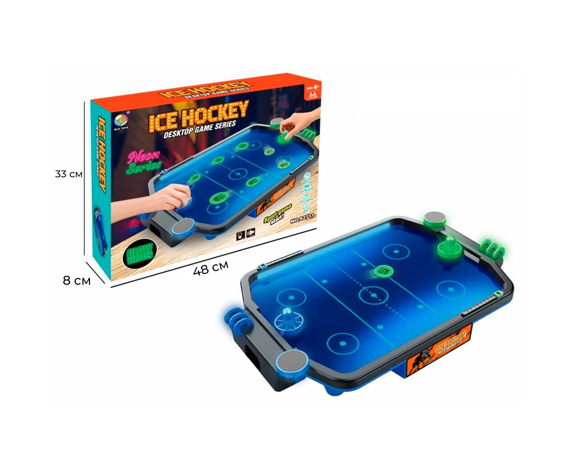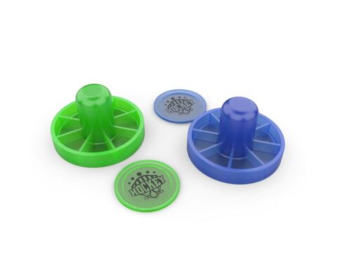 В комплект поставки входят 2 биты диаметром 45 мм и 2 шайбы диаметром 30 мм, которые удобно хранить прямо в столе со сторон игроков. Они из светоотражающего материала и будут подсвечиваться в темноте во время игры.