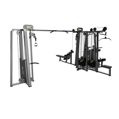 Универсальная конструкция, включающая 5 стеков и выполняющая функции 5 независимых тренажеров: тренажер для вертикальной и горизонтальной тяги; тренажер для формирования дельтовидных и грудных мышц снабжен поворотными рукоятками, которые регулируются под длину рук пользователей, тренажер (гравитрон) предназначен для выполнения упражнений на мышцы спины, груди, рук и ягодиц, а также кроссовер.