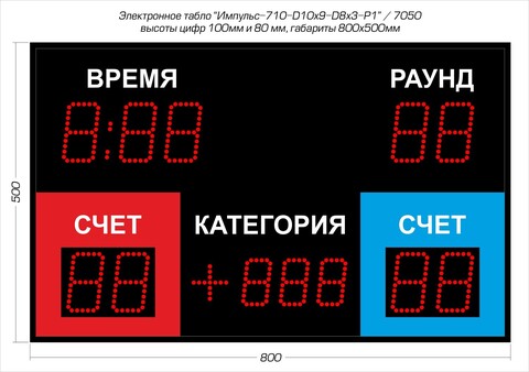 Светодиодное спортивное табло для самбо Импульс-718-D18x11-D8x9-L2xS8x64xP10-L2xS8x32xP10-S2-P1 устанавливаются в помещениях, где проводится турнир (температура эксплуатации от +5°С до +40°С).