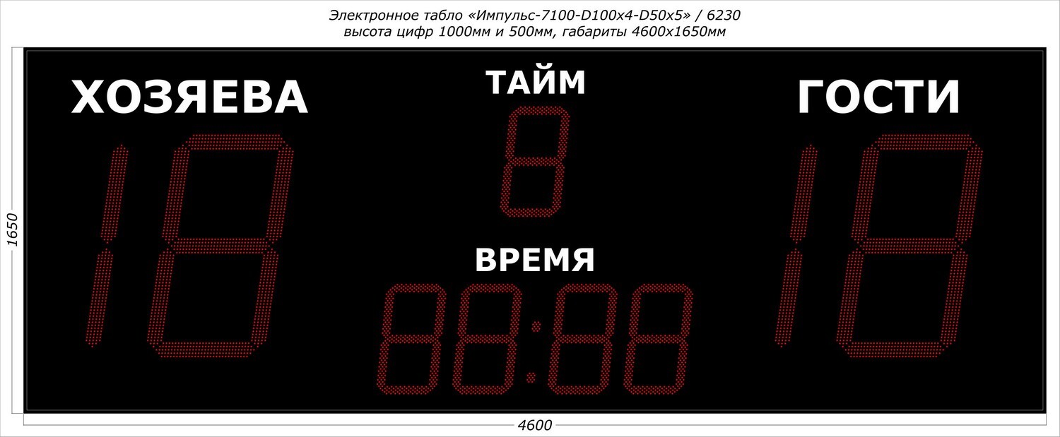 Футбольное спортивное табло Импульс-770-D70x4-D35x5 предназначено для установки в закрытом спортивном зале (модификация R) или на открытом стадионе (модификация ER2).