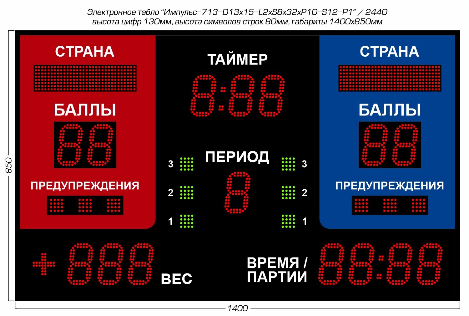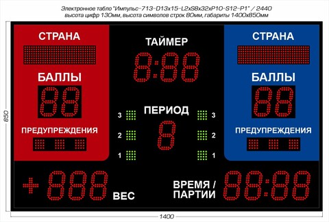 | Отображаемые данные параметры | счет в каждом из 5 сетов, формат цифровой [8]; счет в гейме, формат цифровой [88]; направление подачи мяча, формат "семафор"; данные представляются по каждому из 2 участников соревнований |