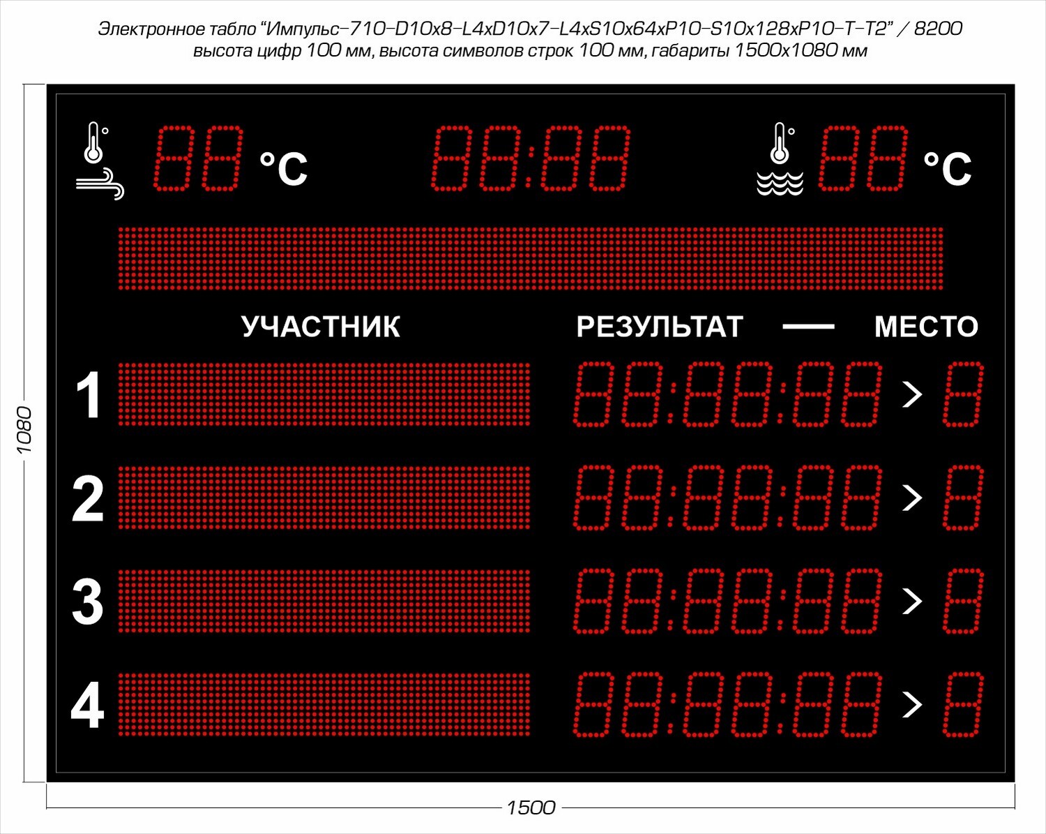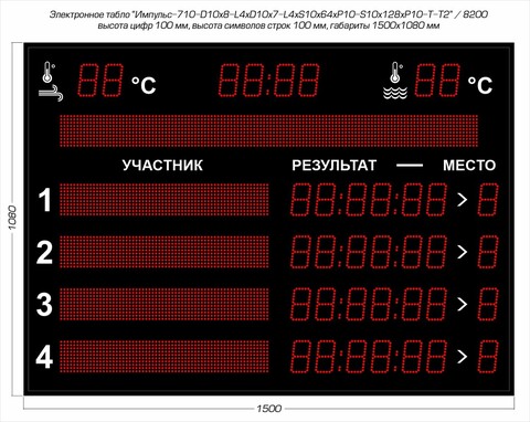 Табло Импульс-710-D10x8-L4xD10x7-L4xS10x64xP10-T-T2 также позволяет отражать текущее астрономическое время, температуру воздуха и температуру воды в бассейне.