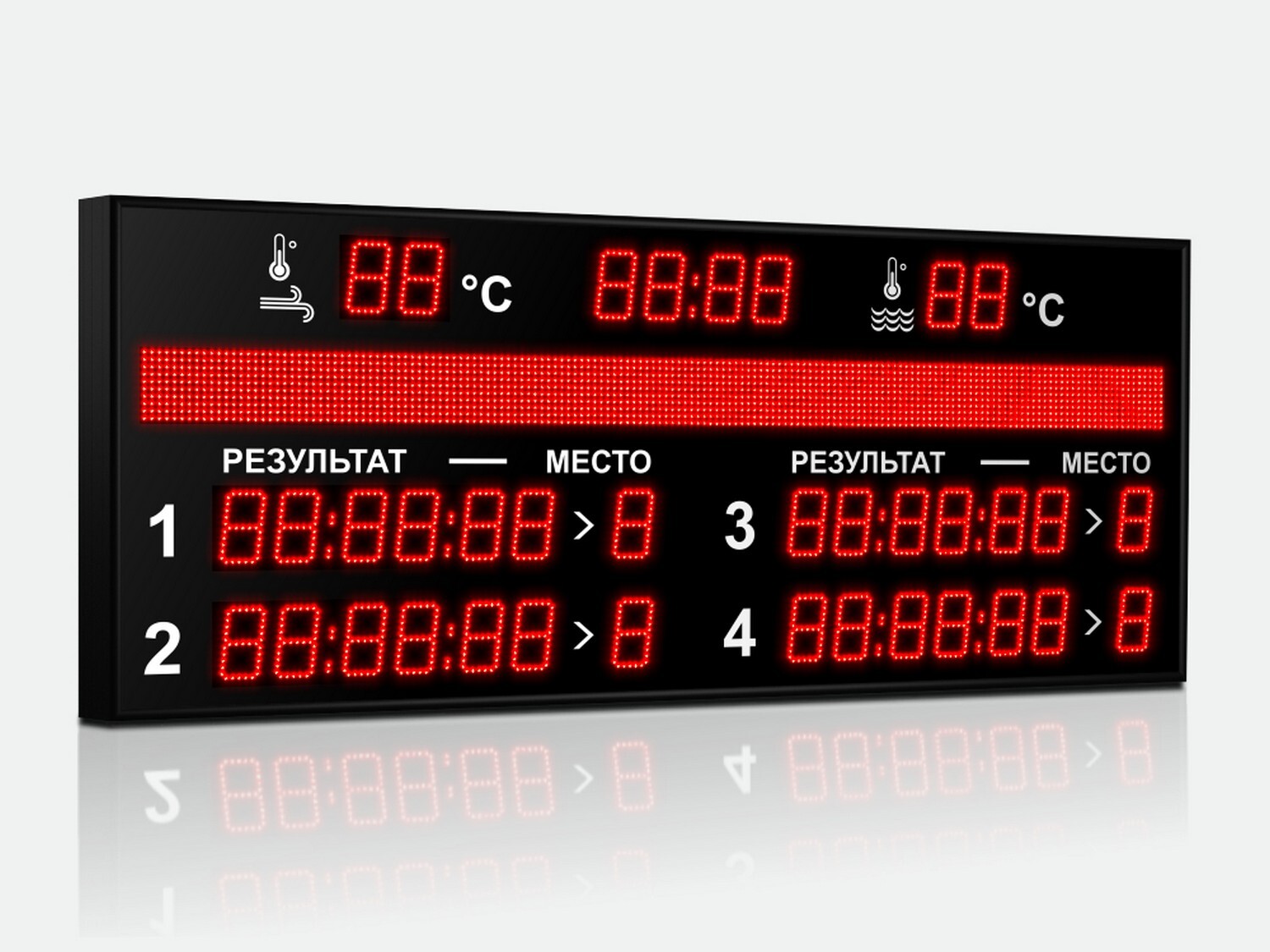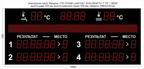Электронное светодиодное табло для плавания Импульс-710-D10x8-L4xD10x7-T-T2 предназначено для фиксации и воспроизведения результатов спортивного состязания по плаванию на 4 дорожках.