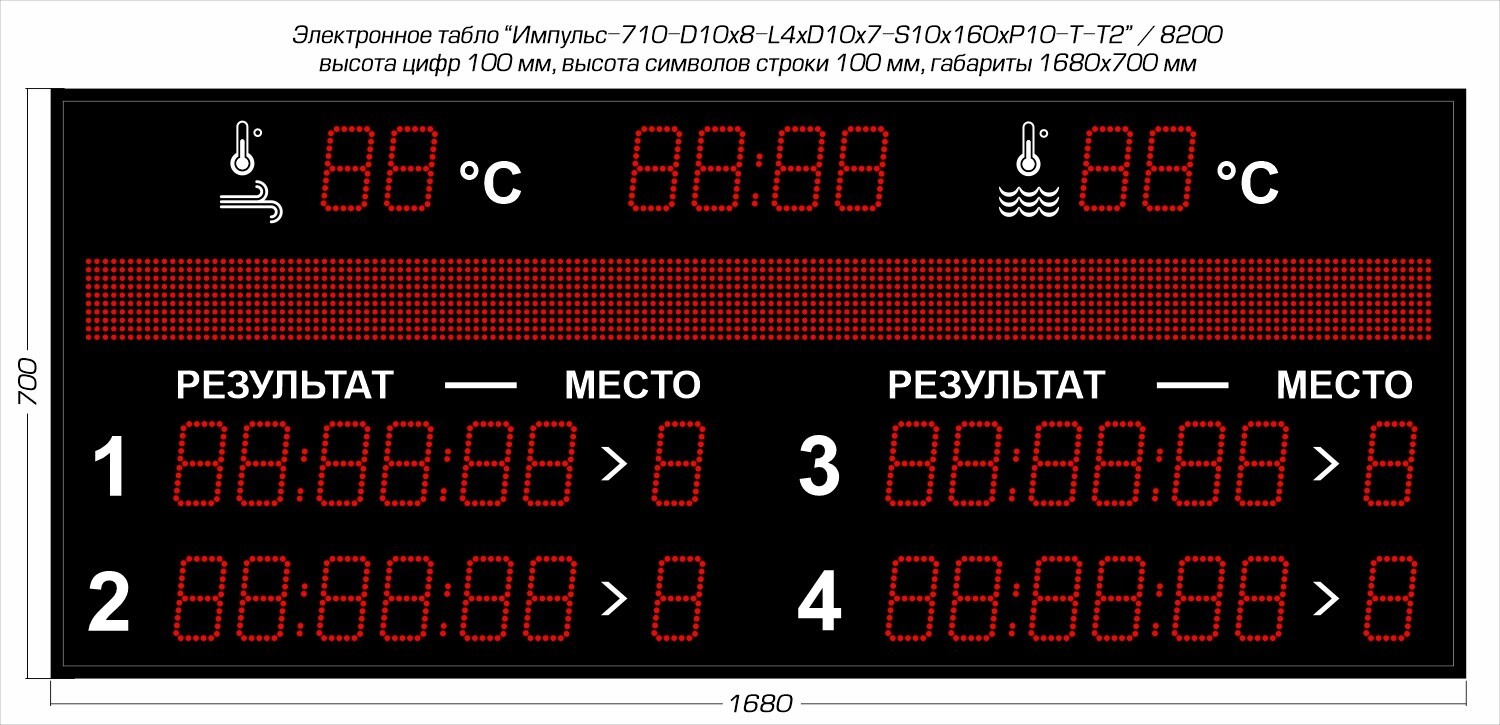 Табло Импульс-710-D10x8-L4xD10x7-T-T2 также позволяет отражать текущее астрономическое время, температуру воздуха и температуру воды в бассейне.