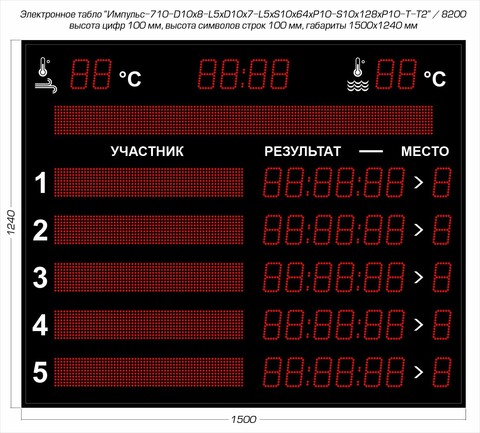 Табло Импульс-710-D10x8-L5xD10x7-L5xS10x64xP10-T-T2 также позволяет отражать текущее астрономическое время, температуру воздуха и температуру воды в бассейне.
