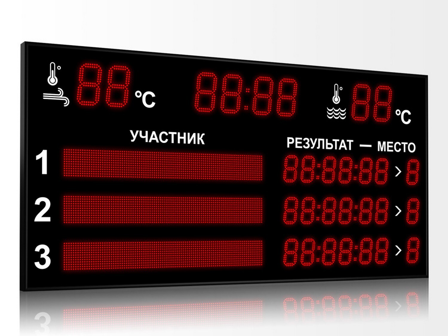 Табло предназначено для установки в бассейны и закрытые влажные помещения (температура эксплуатации от +5°С до +40°С).