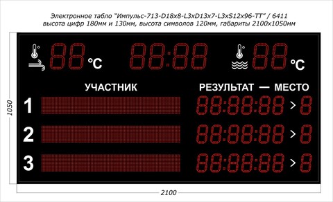 Табло Импульс-713-D18x8-L6xD13x7-T-T2 также позволяет отражать текущее астрономическое время, температуру воздуха и температуру воды в бассейне.