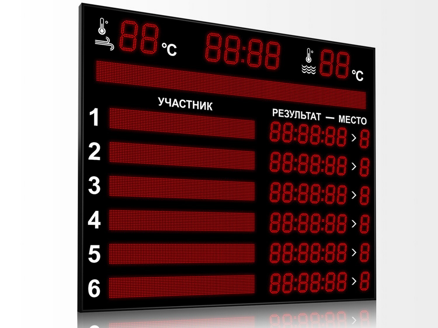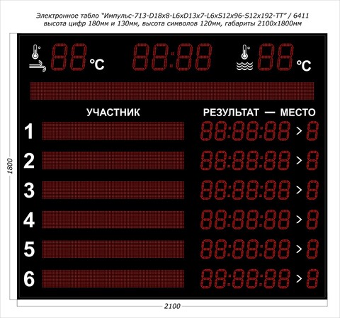 Табло Импульс-713-D18x8-L6xD13x7-L6xS12x96xP10-T-T2 также позволяет отражать текущее астрономическое время, температуру воздуха и температуру воды в бассейне.