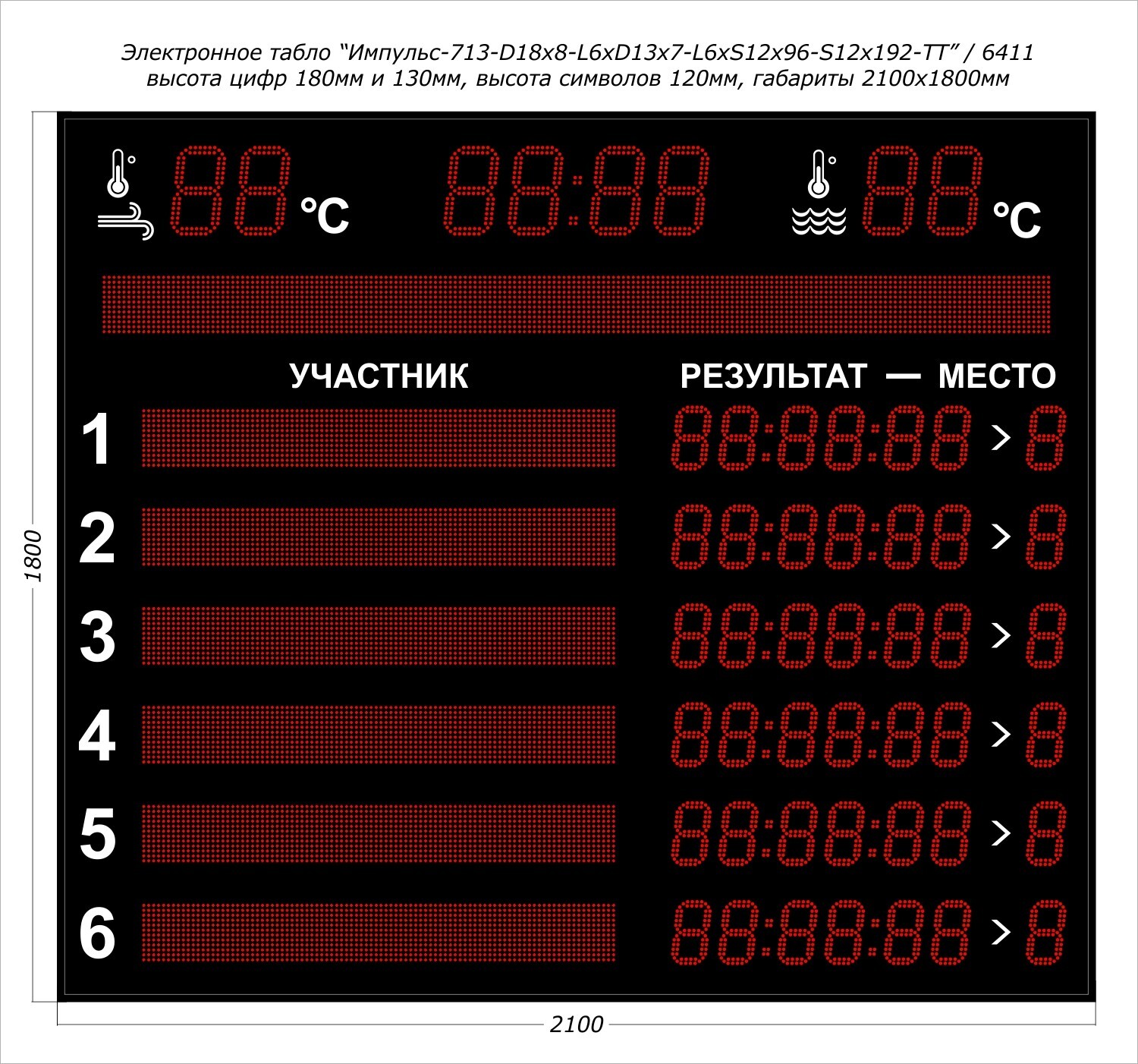 Электронное светодиодное табло для плавания Импульс-713-D18x8-L6xD13x7-L6xS12x96xP10-T-T2 предназначено для фиксации и воспроизведения результатов спортивного состязания по плаванию на 6 дорожках.