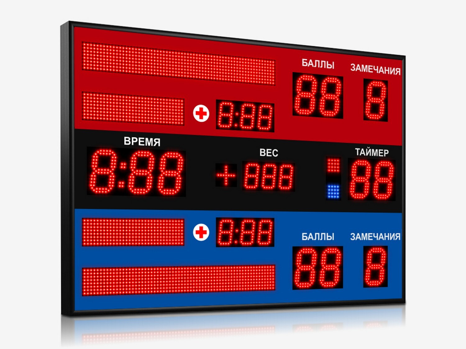 Табло воспроизводит текущие и итоговые результаты соревнований по самбо: набранные спортсменами баллы, время поединка, весовую категорию, таймер-время удержания, количество замечаний спортсменов, фамилии и названия стран спортсменов, время оказания медицинской помощи.
