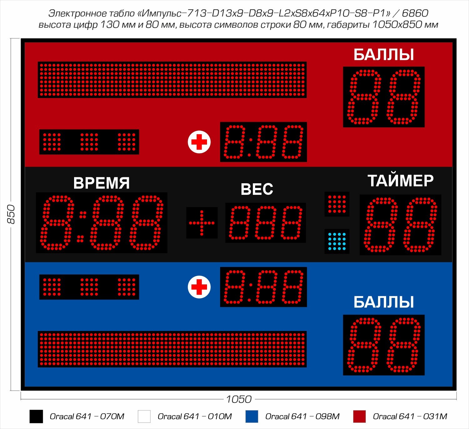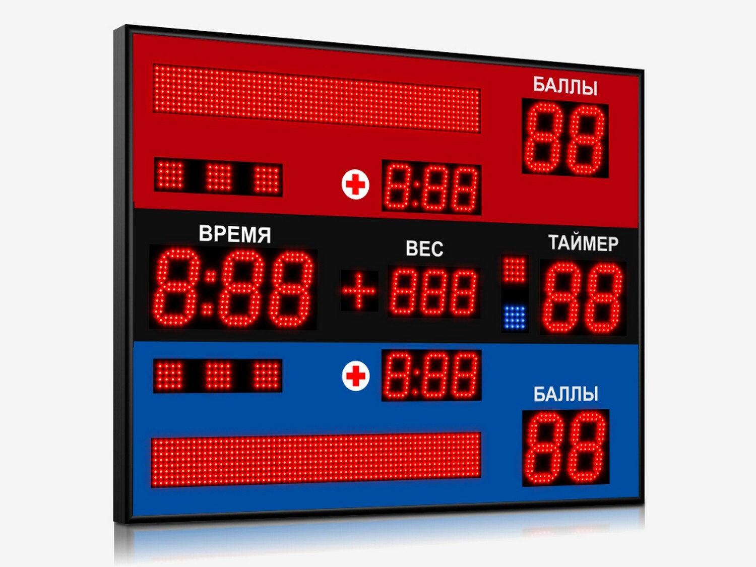 Светодиодное спортивное табло для самбо Импульс-710-D10x9-D8x9-L2xS8x64xP10-S8-P1 устанавливаются в помещениях, где проводится турнир (температура эксплуатации от +5°С до +40°С).