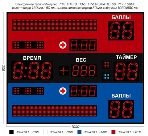 Спортивное табло для самбо Импульс-710-D10x9-D8x9-L2xS8x64xP10-S8-P1 можно дополнить звуковой сиреной, передвижной тележкой, дополнительными пультами и опциями управления.