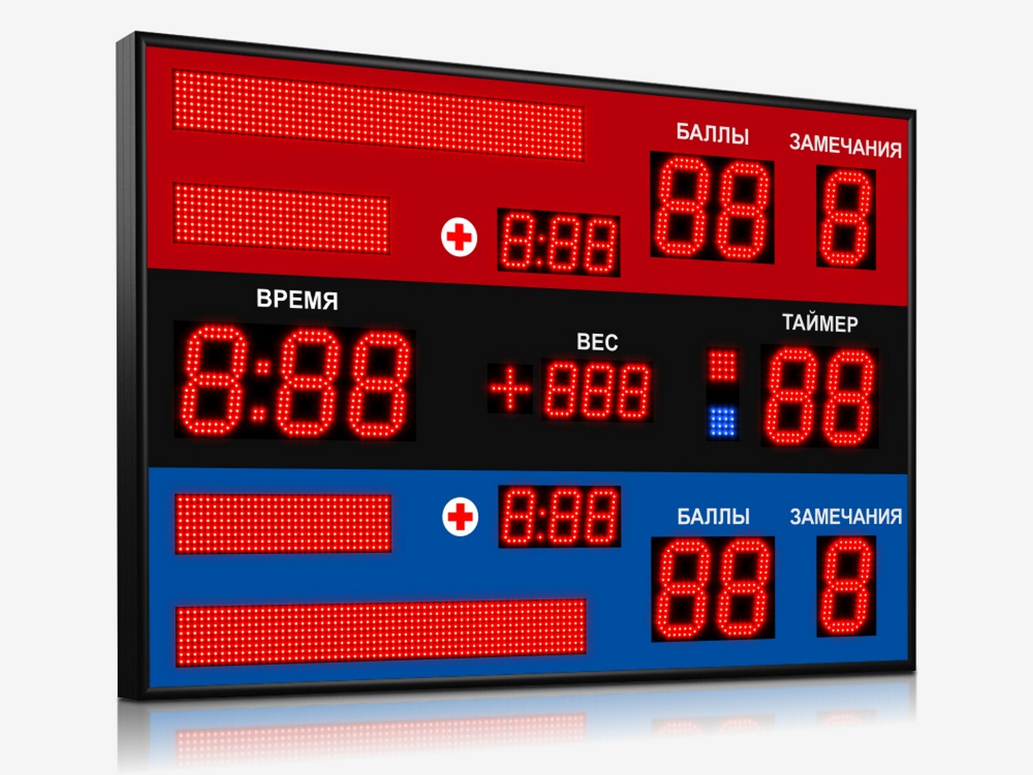Табло воспроизводит текущие и итоговые результаты соревнований по самбо: набранные спортсменами баллы, время поединка, весовую категорию, таймер-время удержания, количество замечаний спортсменов, фамилии и названия стран спортсменов, время оказания медицинской помощи.