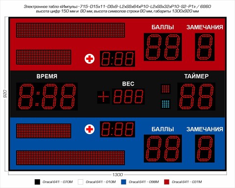 Светодиодное спортивное табло для самбо Импульс-713-D13x11-D8x9-L2xS8x64xP10-L2xS8x32xP10-S2-P1 устанавливаются в помещениях, где проводится турнир (температура эксплуатации от +5°С до +40°С).