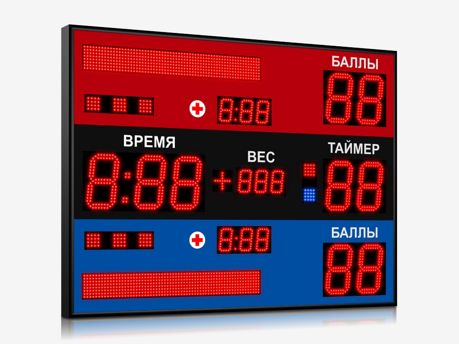 Табло воспроизводит текущие и итоговые результаты соревнований по самбо: набранные спортсменами баллы, время поединка, весовую категорию, таймер-время удержания, количество замечаний спортсменов, фамилии спортсменов, время оказания медицинской помощи.