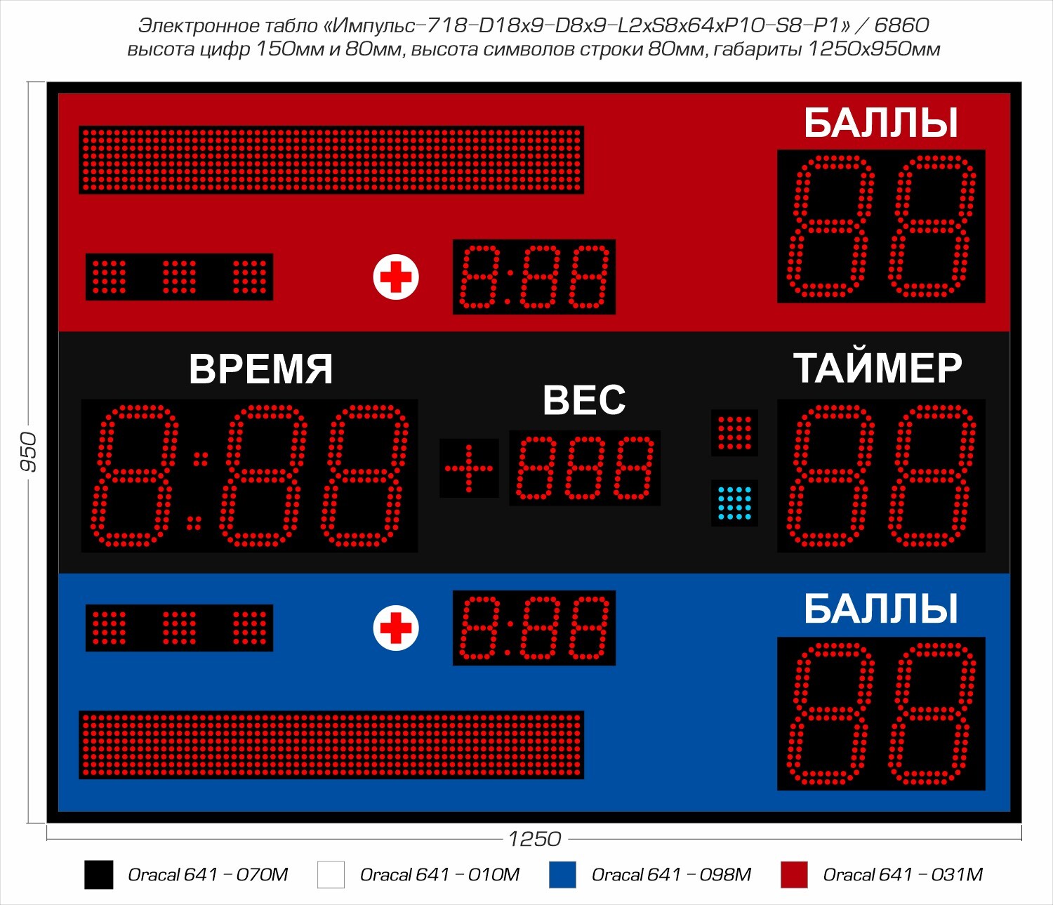 Светодиодное спортивное табло для самбо Импульс-715-D15x9-D8x9-L2xS8x64xP10-S8-P1 устанавливаются в помещениях, где проводится турнир (температура эксплуатации от +5°С до +40°С).