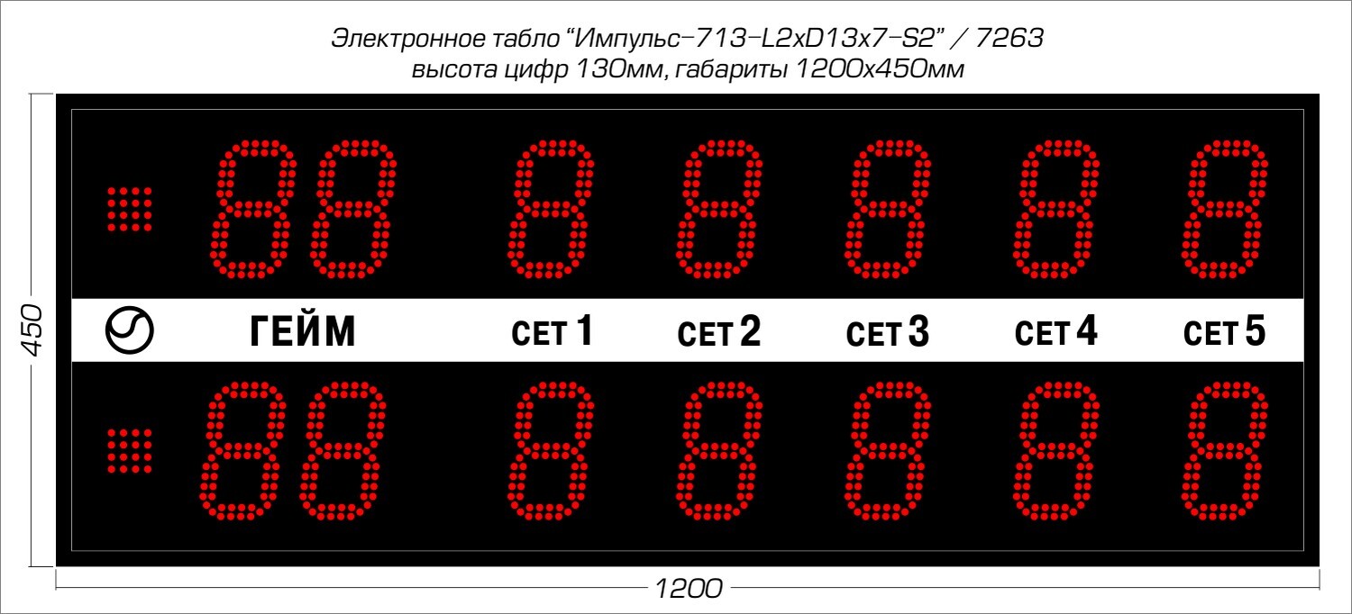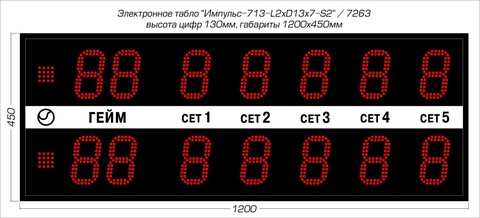 Светодиодное спортивное табло для тенниса Импульс-713-L2xD13x5-S2 устанавливается на закрытых (модификация -R) или открытых (модификация -ER2) теннисных кортах и воспроизводит промежуточные и итоговые результаты соревнования 2 спортсменов. Результаты игры: счет по 3 сетам, счет в гейме отображаются на индикаторах высотой 130 мм, что позволяет считывать информацию с расстояния - до 50м. Размер табло: 900х450мм.