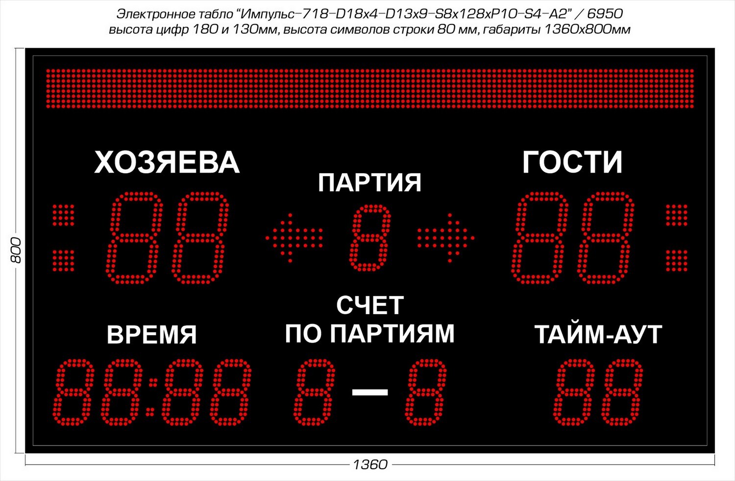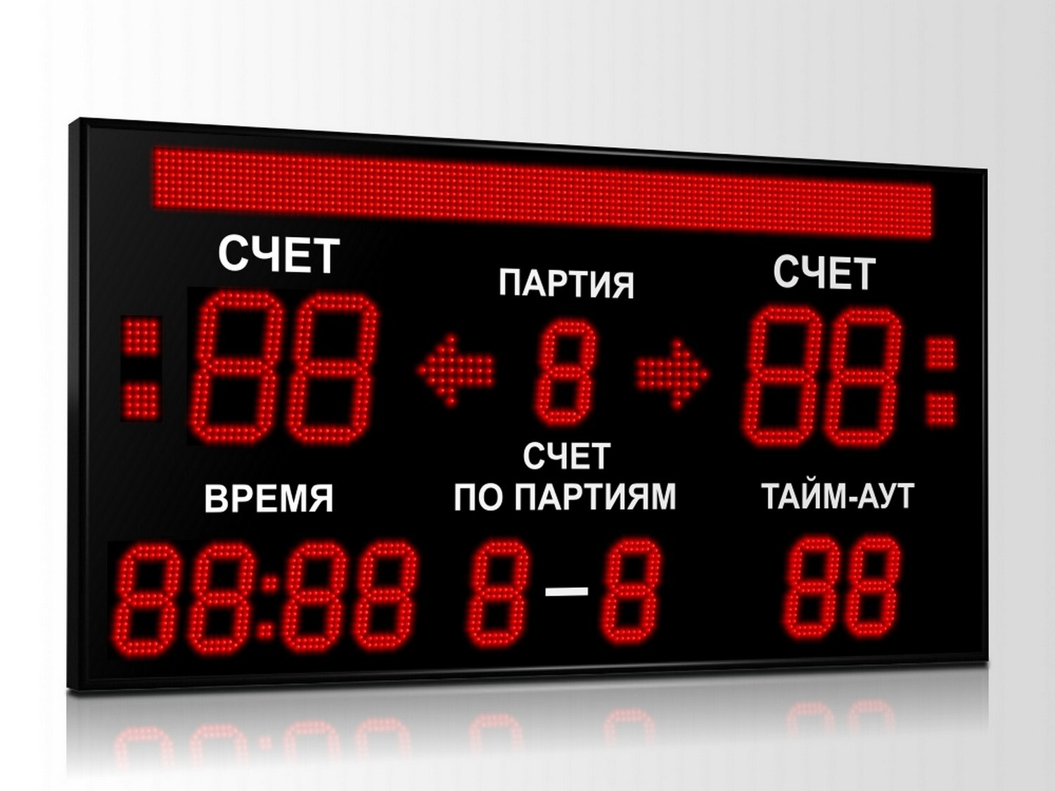 Оно отображает названия команд, текущий счет для обеих команд, номер периода, игровое время, командные фолы, количество затребованных тайм-аутов, направление владения мячом. Высота цифровых индикаторов 350 мм и 270 мм, высота строки 160мм.