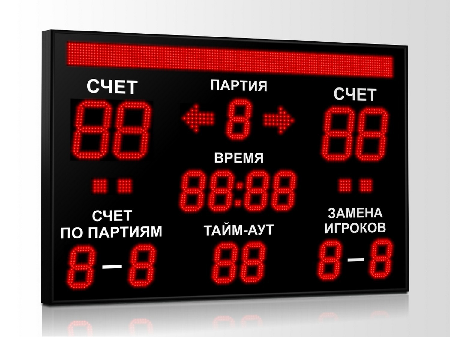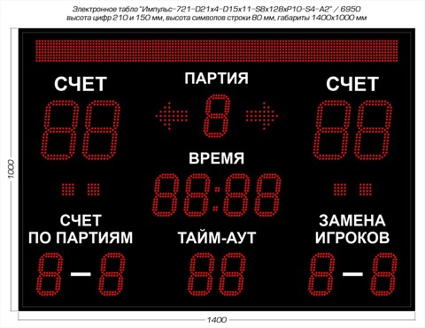 Электронное спортивное табло для волейбола Импульс-718-D18x4-D13x11-S8x128xP10-S4-A2 используется для проведения соревнований в спортивных залах и на открытом воздухе. Данное волейбольное табло отображает данные в цифровом формате: номер партии, счет для обеих команд, счет по партиям и т.д.