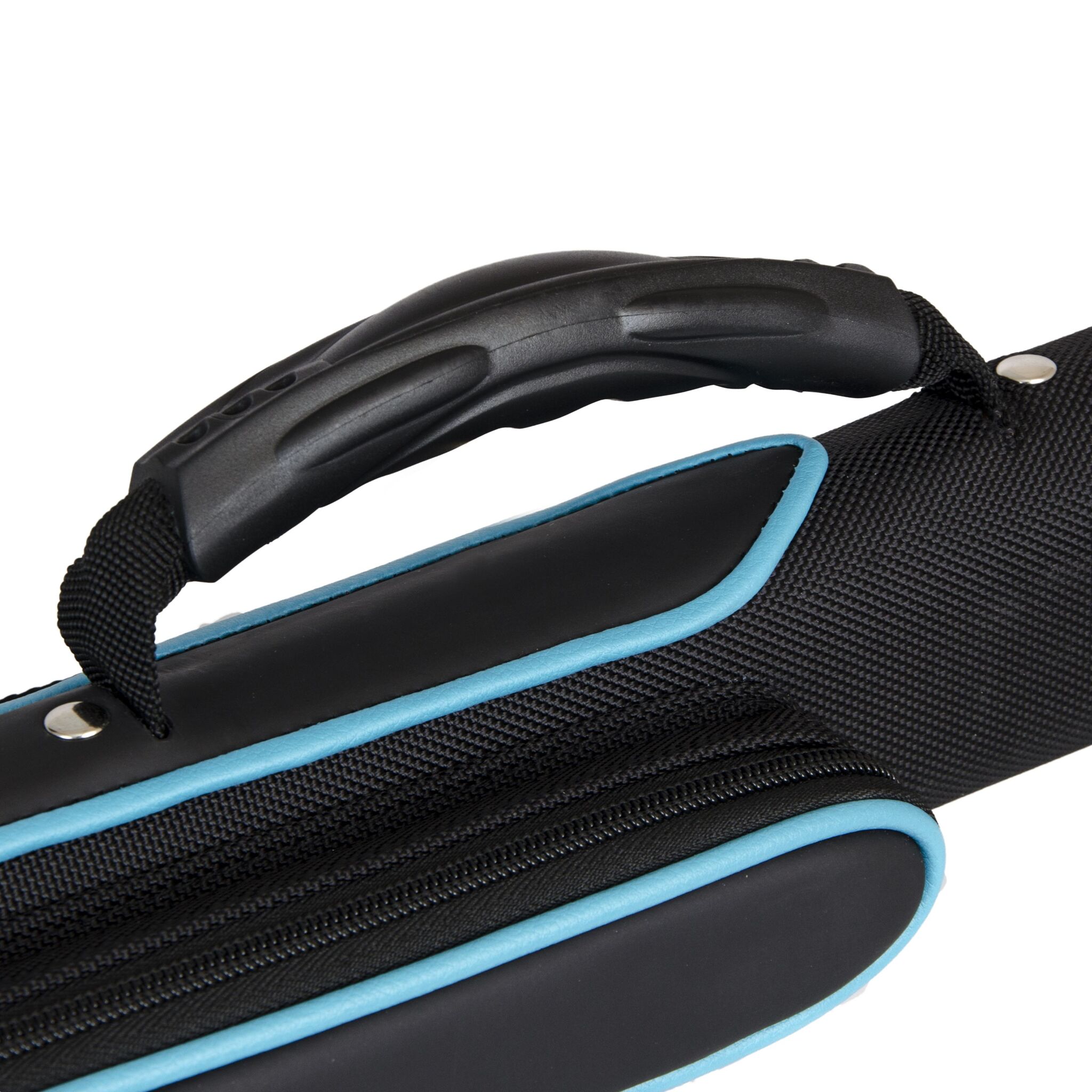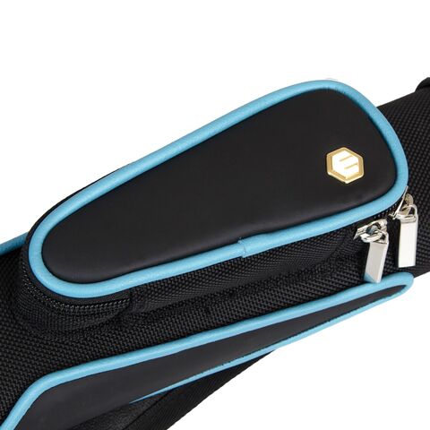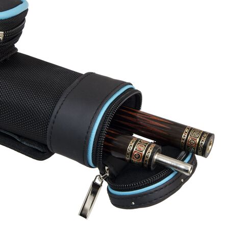 Есть ручка сбоку и наплечный ремень с регулировкой длины. На ремне есть специальная вставка для комфортной носки на плече. Каждая часть кия хранится в отдельном отсеке. С внешней стороны имеются карманы для аксессуаров и удлинителя. Большой карман внутри снабжен дополнительной молнией для надежной фиксации.