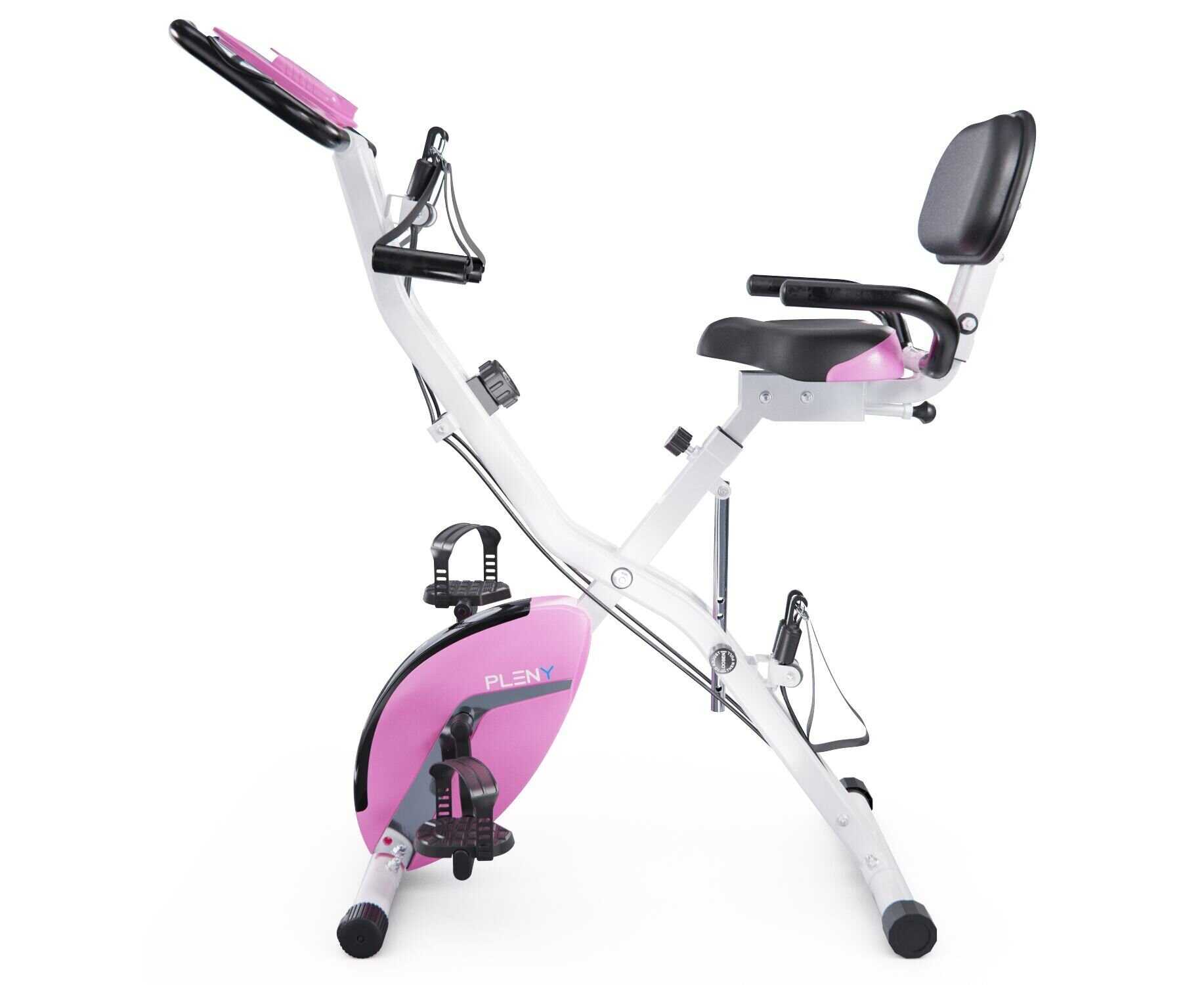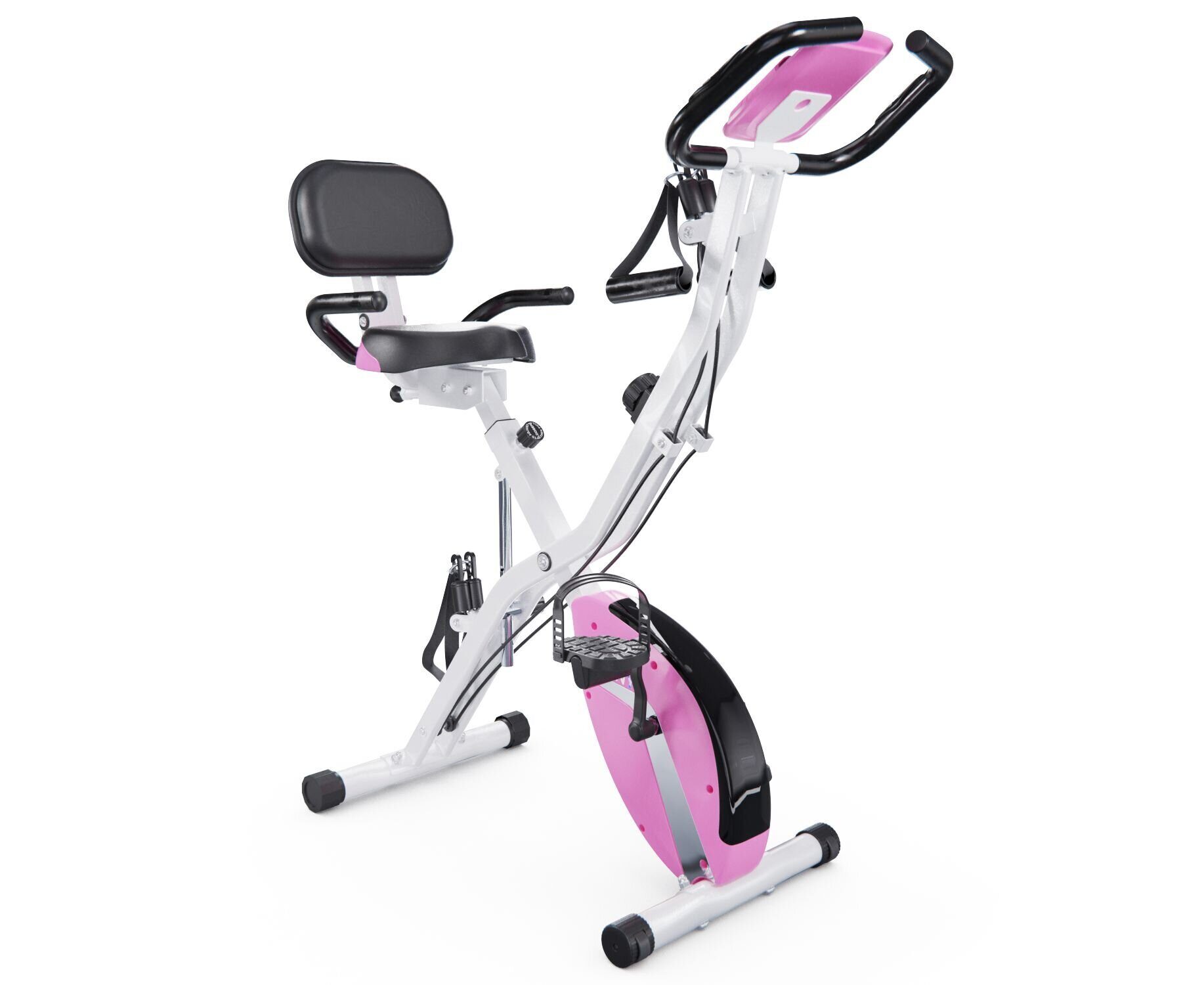 Вертикальный велотренажер с эспандерами DFC X-Bike PLENY CF-917FM-2 — идеальный кардиотренажер для домашних тренировок. Этот велотренажёр представляет собой современный кардиотренажер для ног и рук домашний, который сочетает эффективную аэробную нагрузку с возможностью проработки мышц верхней части тела. Как велотренажер для ног, он обеспечивает качественную нагрузку на мышцы бёдер, ягодиц и икр, а встроенные эспандеры превращают его в полноценный тренажер для ног и рук. Максимальный вес пользователя – 120 кг, что делает тренажер кардио доступной для широкого круга людей. Модель подходит для пользователей с разным уровнем подготовки – от новичков до опытных спортсменов. Тренажер для ног оснащен 16 уровнями нагрузки, которые регулируются механически. Инерционный вес маховика 3 кг. Магнитная система сопротивления обеспечивает плавный и бесшумный ход, что делает тренировки комфортными даже вечером или ранним утром. Встроенный монохромный LCD-дисплей отображает ключевые параметры: скорость, время, дистанцию, пульс, количество сожженных калорий и режим сканирования данных. Работает дисплей от 2-х батареек ААА, идущих в комплекте. Эргономичное регулируемое сиденье позволяет настроить тренажер под любой рост. Педали с противоскользящим покрытием и 4 уровнями фиксации ремней надежно удерживают стопу во время интенсивной тренировки. Датчики пульса на рукоятках помогают контролировать нагрузку без дополнительных устройств. Благодаря складной конструкции тренажер легко хранить даже в небольших помещениях. В сложенном виде его габариты составляют 38 × 41 × 145 см. Встроенные транспортировочные ролики позволяют без усилий перемещать его по комнате, а компенсаторы неровностей пола обеспечивают устойчивость на любой поверхности. В комплекте идут эспандеры длиной 72 см для проработки мышц рук и плеч, а также ремень на лодыжку для тренировки ног. Подставка под планшет или смартфон делает тренировки более увлекательными – можно смотреть фильмы, сериалы или онлайн-уроки. Велотренажер домашний DFC X-Bike PLENY CF-917FM-2 – это современный, функциональный и компактный тренажер для домашнего использования. Он поможет поддерживать форму, укреплять мышцы и улучшать общее самочувствие и здоровье!